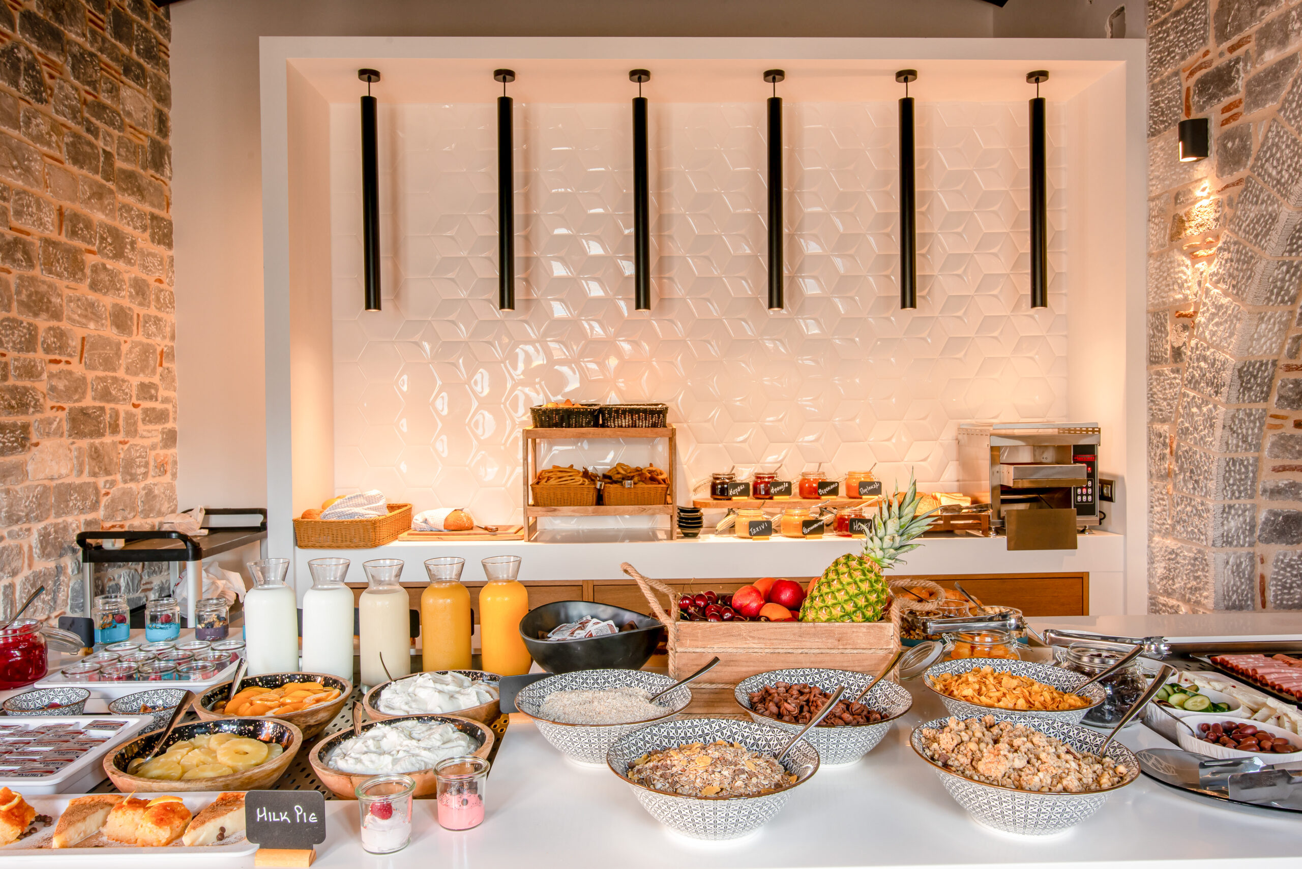 Everything is served with care in a bright, inviting space overlooking the Bay of Oitylo — the perfect start to an authentic hospitality experience.